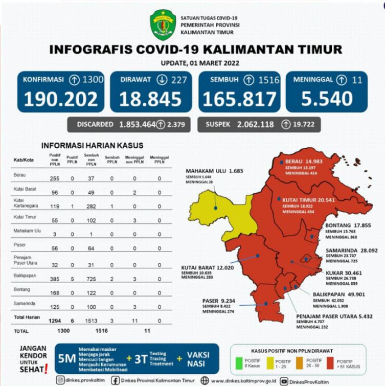 Sedangkan kasus positif di Kaltim ada 1300 kasus baru dari Berau 255 kasus, Kutai Barat 96 kasus, Kutai Kartanegara 119 kasus, PPLN 1 kasus, Kutai Timur 55 kasus, Mahakam Ulu 3 kasus, Paser 56 kasus, Penajam Paser Utara 32 kasus, Balikpapan 385 kasus, PPLN 5 kasus, Bontang 168 kasus dan Samarinda 125 kasus.