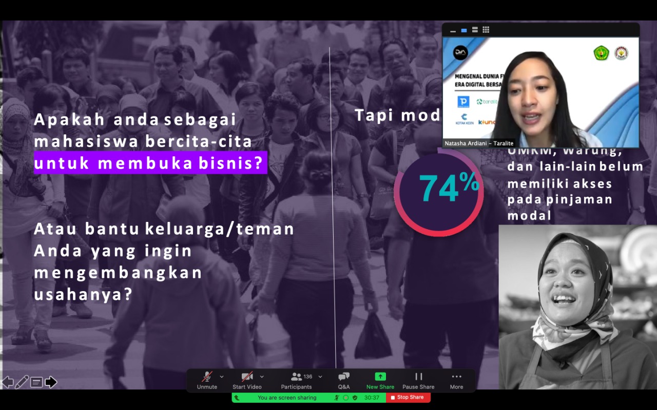 Upaya konsisten untuk mendorong inklusi keuangan di tengah pandemi global yang saat ini dialami banyak negara termasuk Indonesia, platform fintech P2P lending berizin dan diawasi Otoritas Jasa Keuangan (OJK) PT Indonusa Bara Sejahtera (Taralite) dan platform terdaftar PT. Prima Fintech Indonesia (Teman Prima) menyelenggarakan talk show dengan mahasiswa Universitas Palangka Raya pada hari Jumat, 20 November 2020 secara daring melalui aplikasi komunikasi video untuk mengenalkan industri fintech peer-to-peer lending serta pemahaman inovasi yang dilakukan fintech untuk tetap mendorong inklusi keuangan selama masa pandemi.